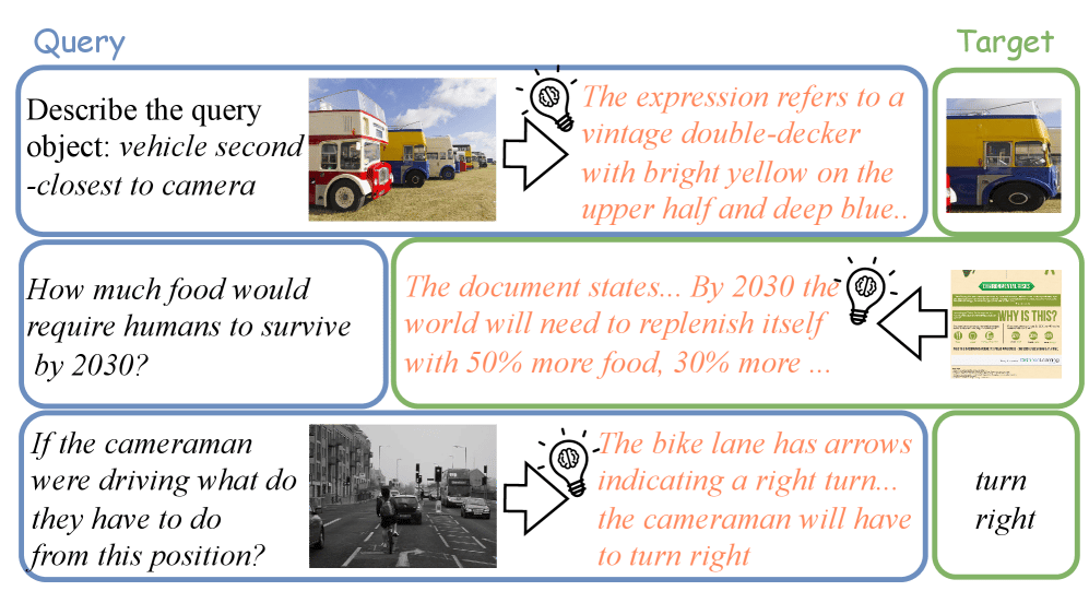 This work demonstrates that explicit reasoning can substantially enhance multimodal embeddings, which are crucial for tasks that require understanding and integrating language and vision. The flexible TTE framework allows leveraging large, powerful reasoners or fine-tuning smaller models for efficiency, making high-quality multimodal representations more accessible. Improvements in embedding quality directly benefit applications like visual question answering, grounding, and multimodal retrieval. Moreover, this approach opens new avenues for research on combining reasoning and representation learning, pushing the boundaries of how AI systems understand complex, multimodal data in real-world scenarios.