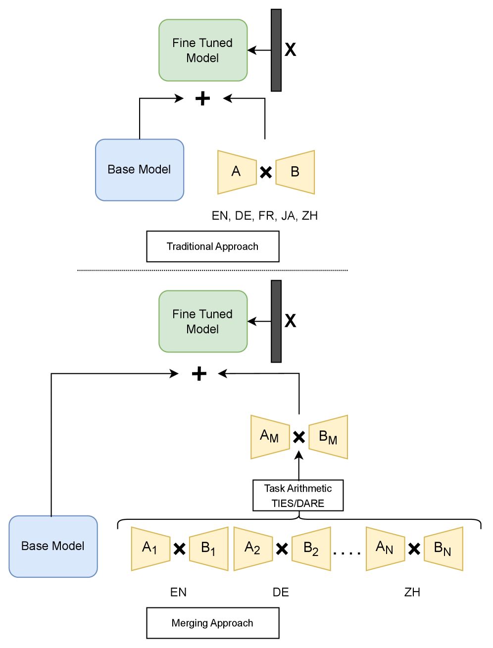- Compared traditional combined dataset fine-tuning with a novel language-specific model merging approach.