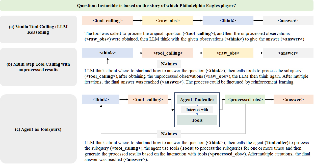 - Introduced the Agent-as-Tool framework, which separates reasoning and tool invocation into two components: a high-level Planner and a Toolcaller.