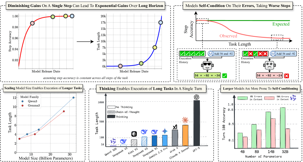 Role of Explicit Reasoning: Enabling models like GPT-5 to perform explicit reasoning (thinking) during execution eliminated the self-conditioning problem and enabled the model to handle over 1,000 steps in a single turn.