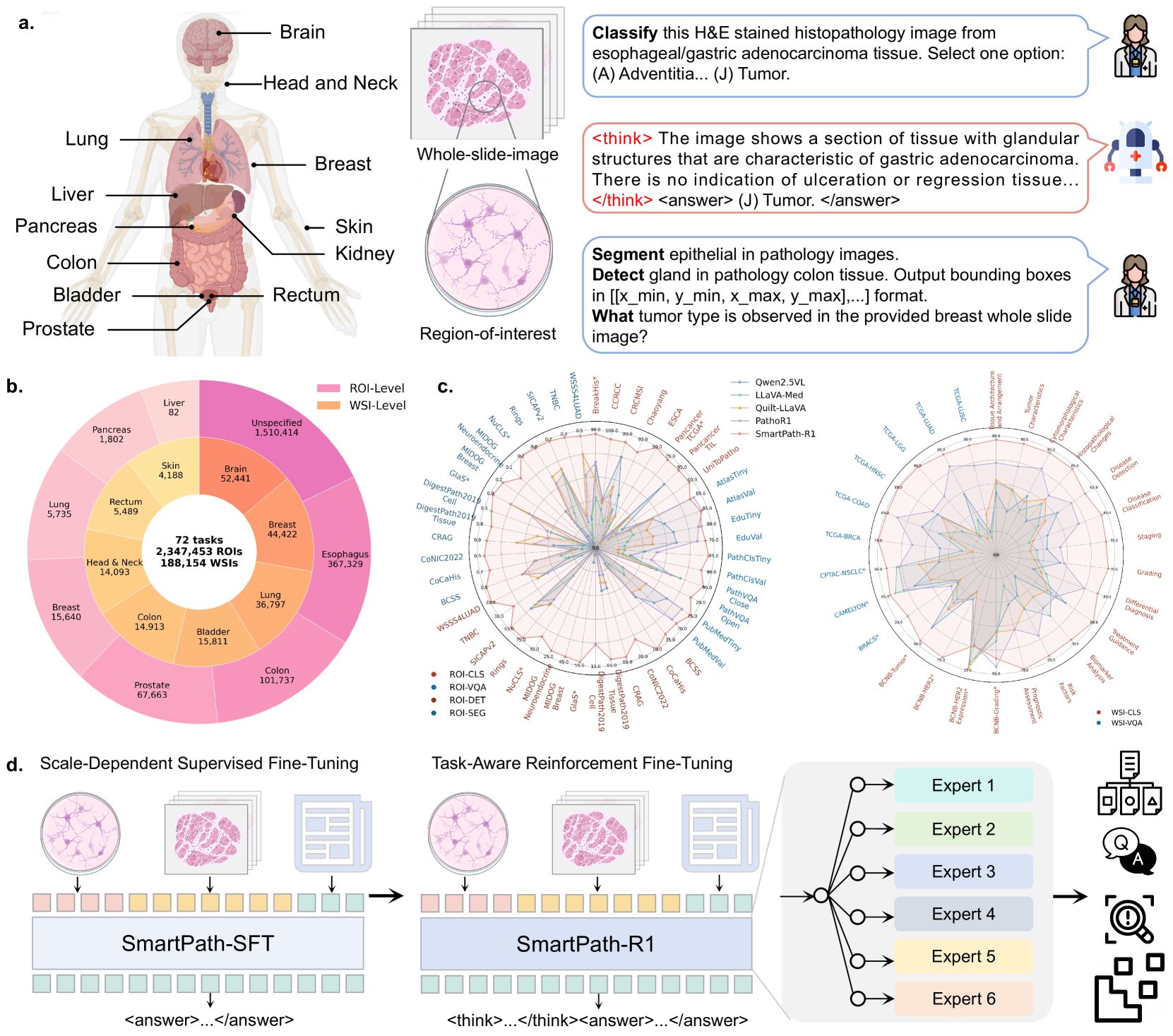 SmartPath-R1 marks a significant advance in computational pathology by unifying reasoning and multiscale analysis within a single, versatile AI model. Its ability to handle a wide range of diagnostic tasks—such as identifying cancer subtypes, detecting lesions, segmenting tissue structures, and answering complex visual questions—mirrors the reasoning process of expert pathologists. This enhances clinical trust and interpretability, crucial for real-world adoption.