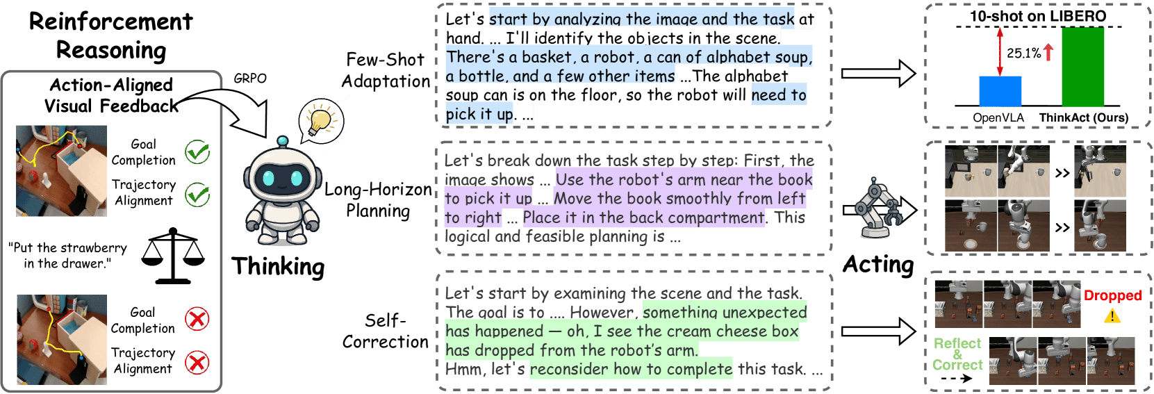 ThinkAct advances the state of embodied AI by effectively combining high-level reasoning with low-level action control through visual latent planning. Its ability to perform long-horizon planning, adapt quickly to new situations, and recover from failures addresses key challenges in robotics, augmented reality, and other embodied AI applications. By demonstrating robust and scalable integration of vision, language, and action, ThinkAct paves the way for more intelligent, adaptable agents that can operate seamlessly in complex, dynamic environments—bringing us closer to truly autonomous embodied systems capable of understanding and manipulating the world with human-like flexibility.